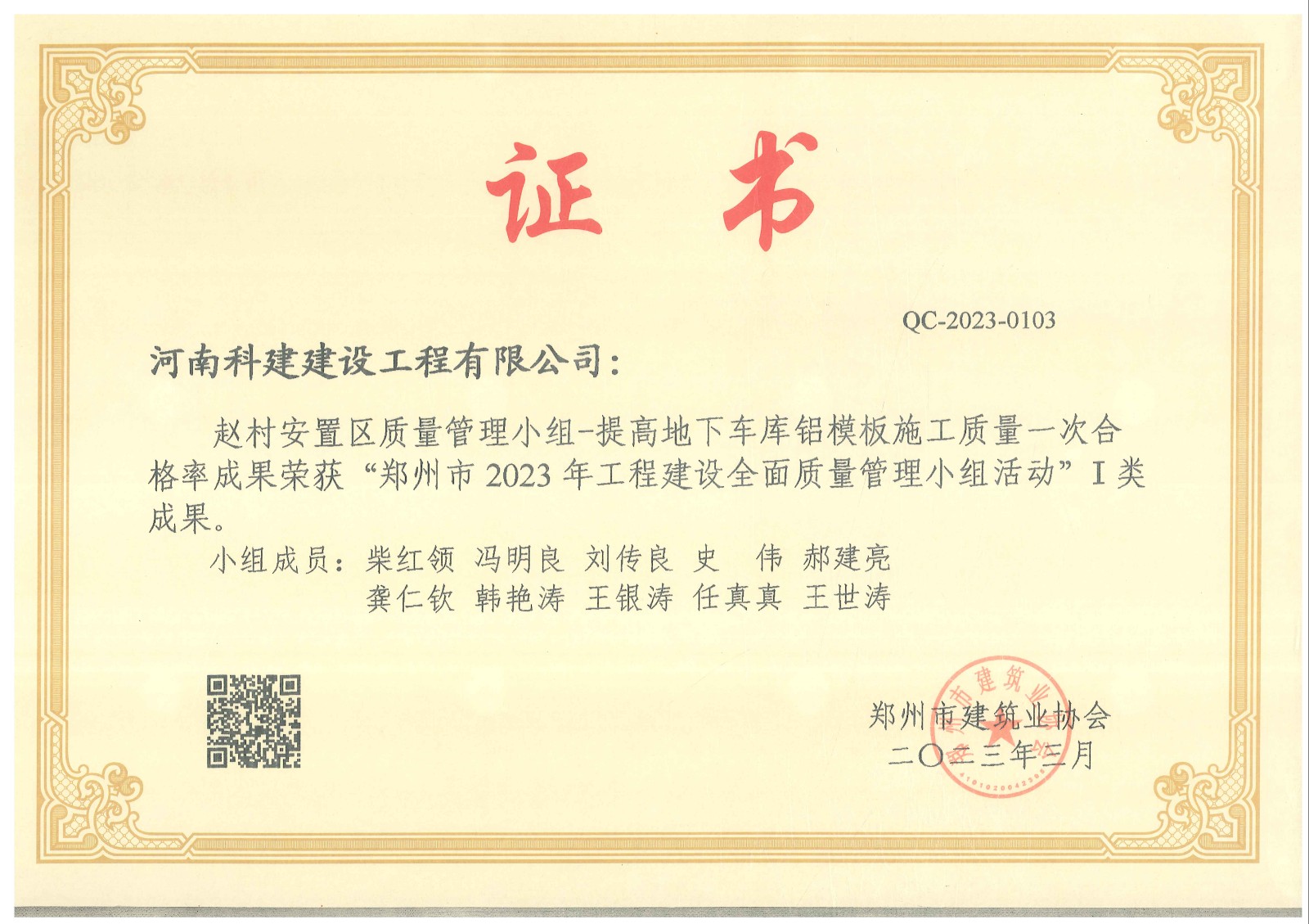 最终我公司海马国际商务中心项目荣获郑州市2023年工程建设全面质量管理优秀QC成果一类成果奖1项,二类成果奖2项。恒大赵村安置区项目荣获一类成果奖1项。经开区人才公寓项目项目荣获一类成果奖1项。